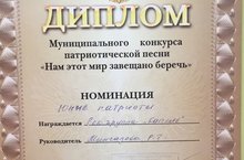 В муниципальном конкурсе патриотической песни "Нам этот мир завещено беречь", получили диплом номинации "Юные патриоты" воспитаники старшей группы под руководством музыкального руководителя Мингазовой Р.Г.
