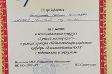 Поздравляем воспитателя Ахметзянову С.В. с 1 местом в муниципальном конкурсе "Лучшей мастер-класс", в рамках проекта "Педагогическая академия" кафедры "Взаимодействие ДОУ с родителями и социумом".