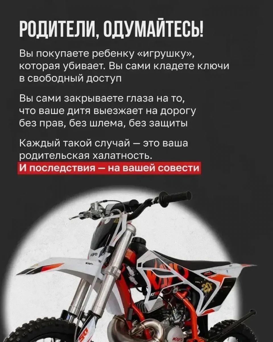 В связи с увеличением числа ДТП с участием питбайков, особенно среди несовершеннолетних, в России водятся новые поправки в правила дорожного движения. По новым правилам родителям предусмотрены штрафы от 30 000 рублей, а также уголовная ответственность.