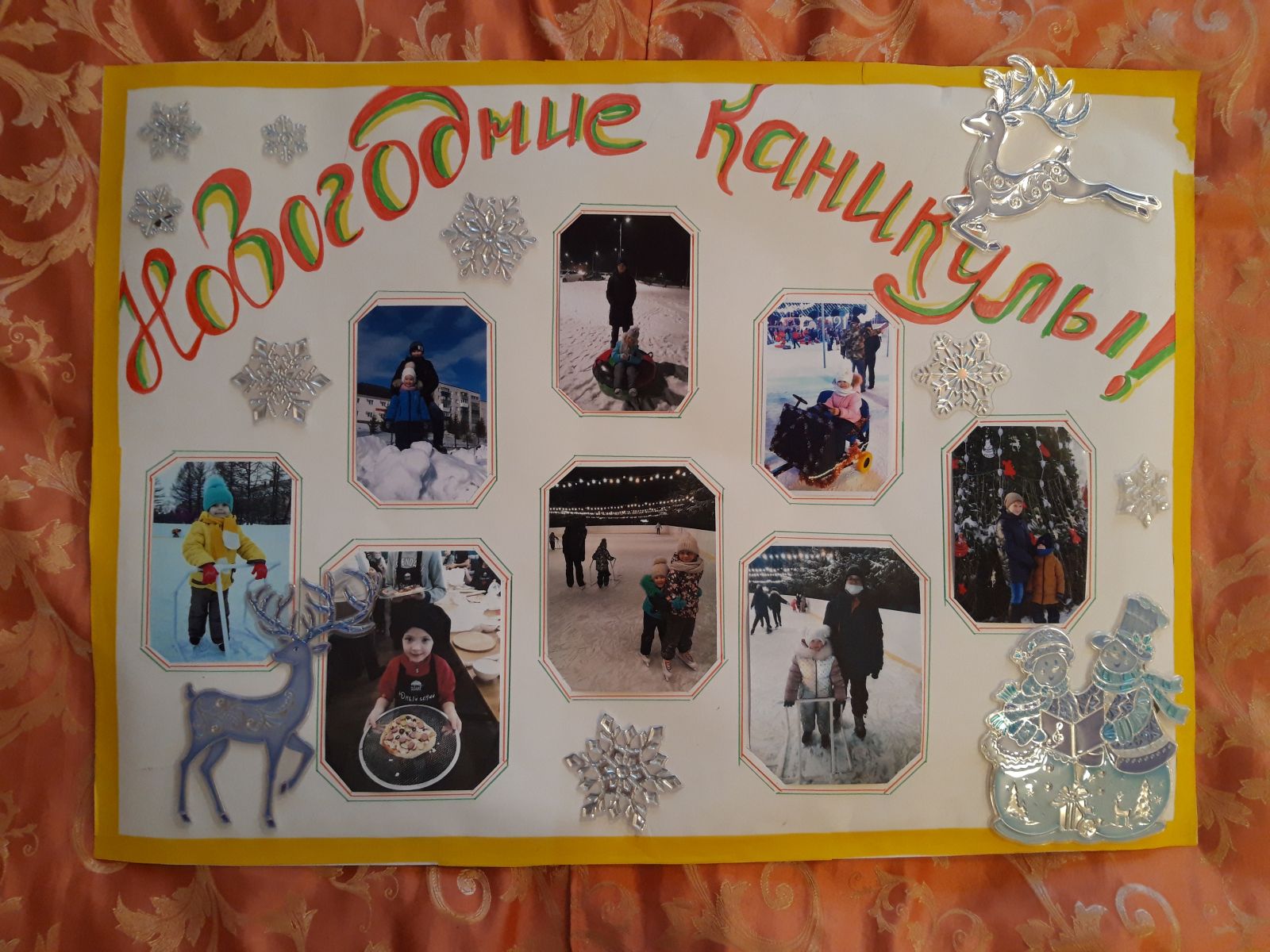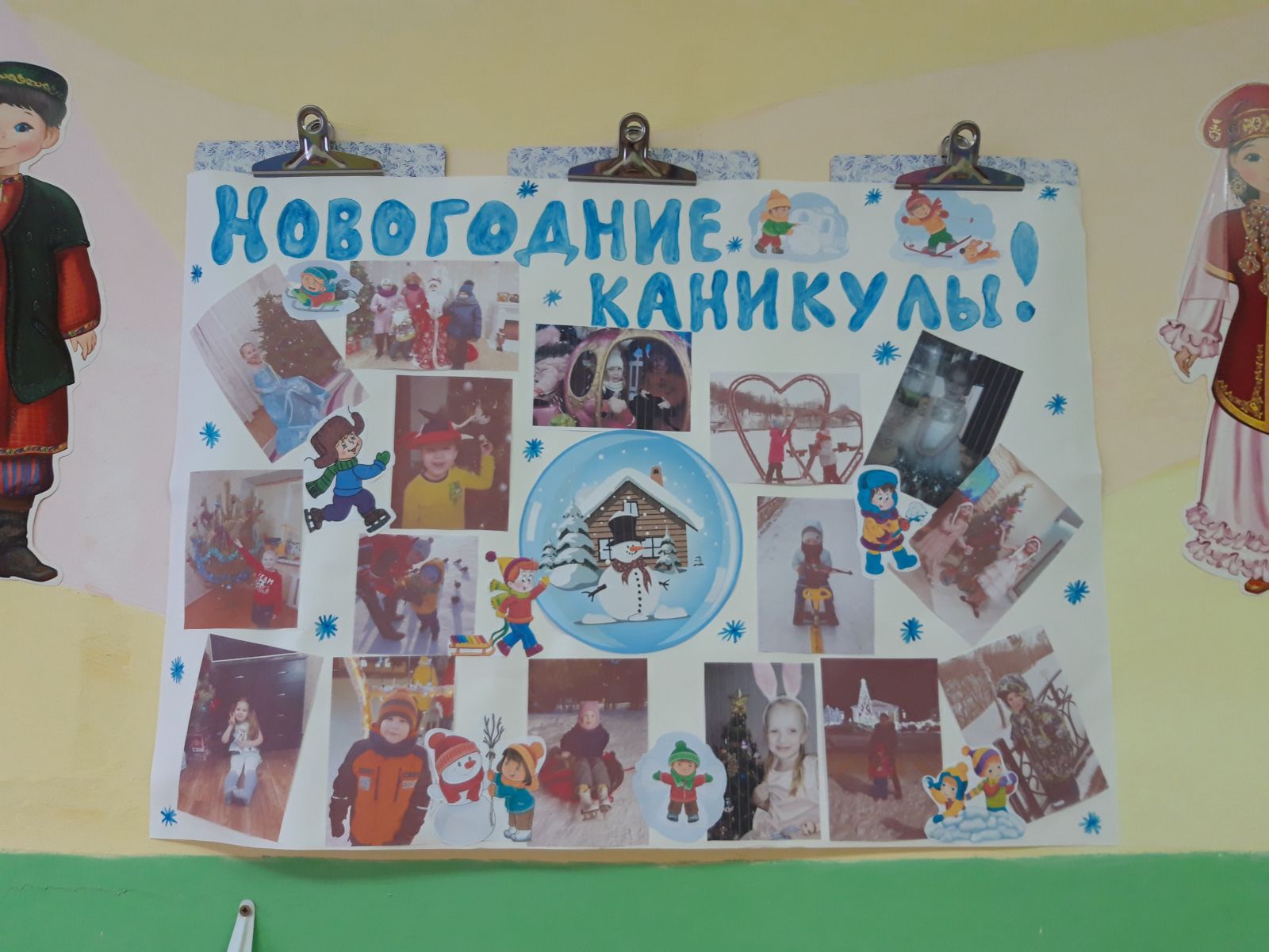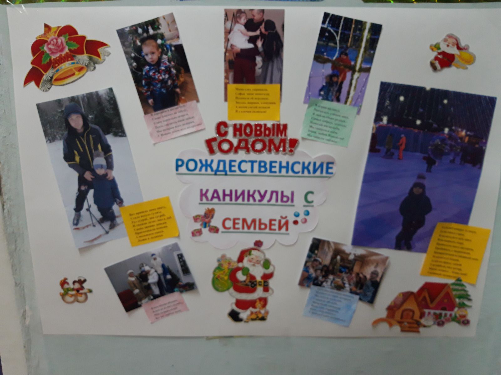 Безнең балалар бакчасында «Яңа ел каникуллары бөтен гаилә белән " дип исемләнгән стенгазета күргәзмәсе оештырылды. Күргәзмәдә гаилә белән кышкы ялның онытылмас мизгелләре турында фотографияләр, фотоколлажлар тәкъдим ителде. Кызык, матур килеп чыкты, һәркем фотосүрәтләрне рәсмиләштерүгә үз җанын кертте. Безнең балалар бакчасында тәрбияләнүчеләр үзләренең кышкы хис-тойгылары турында бик теләп сөйләделәр, ә фотографияләр аларның хикәяләрен тыңлаучылар өчен тагын да кызыклы һәм якты итеп ясадылар.