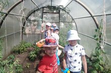 Теплица, которая находится на территории детского сада, занимает важное место в реализации задач по ознакомлению дошкольников с природой, воспитании у них интереса и бережного отношения к ней. Теплица является живой лабораторией. К сожалению, современные дети все больше и больше теряют связь с садом или огородом, редко имеют возможность увидеть выращивание фруктов и овощей вблизи. Оборудование теплиц является одним из способов, чтобы привести детей к дарам садов и огородов, установить между ними прочные дружеские отношения. Работа в теплице развивает у дошкольников любознательность, воспитывает у них интерес к сельскохозяйственному труду и к труду взрослых.Более двух месяцев воспитанники с большим удовольствием знакомились с условиями произрастания огурцов, перца, лука, помидор. А теперь с удовольствием собирают урожай. -