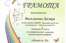 Сегодня стали известны результаты муниципального конкурса "КОМП и Я", где приняли участие как ученики школ нашего города, так и дошкольники. Вильданова Диляра - воспитанница подготовительной группы "Лучики" - пройдя этапы полуфинала, финала - стала победительницей конкурса среди детей дошкольного возраста и заняла 1 место. Графические рисунки - очень сложное занятие, которое не подвластно и некоторым взрослым. Но наша Диляра проявила хорошие способности к рисованию в графическом редакторе и смогла покорить жюри не только своими техническими возможностями, но и своей детской фантазией, оригинальностью и творческими находками в передачи сюжета. Поздравляем Диляру, а также её родителей и воспитателя Сибгатулину Гульсиру Минигалиевну с высоким результатом на муниципальном уровне!