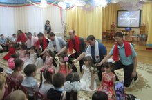 Воспитатели Ханнанова Р.З. и Камалиева И.Р. самостоятельно подготовили сценарий, детей, привлекли к участию дедушку воспитанника, которые вместе с внуком исполнили песню с аккомпонементом "Три танкиста". Воспитанники средней группы познакомились в ходе развлечения с военными профессиями, в игровой форме с понятиями "маскировка", отвечали на шуточные вопросы и загадки. Все воспитанники групп подготовили папам подарки, а девочки поздравили самоделками мальчиков группы.
