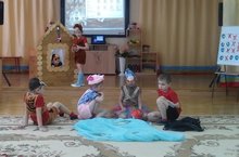 Дети старшей группы "Цветочки", которые посещают кружок по английскому языку - Нариман, Полина и Ильшат показали сказку "Winnie-the-Pooh goes to guest" (Винни пух идет в гости).