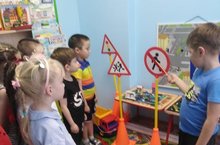 4. В группах старшего возраста ребята играли в игру «Опасные участки на пешеходной части улицы», знакомство с опасными ситуациями, которые могут возникнуть на отдельных участках городских улиц, с соответствующими мерами предосторожности; различными способами ограждения опасных зон тротуара, с некоторыми знаками, предупреждающими об опасности.