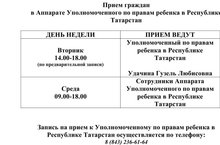 Информация о приёме граждан в Аппарате Уполномоченного по правам ребёнка в Республике Татарстан.