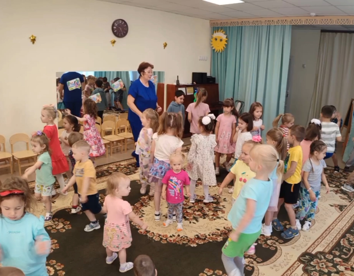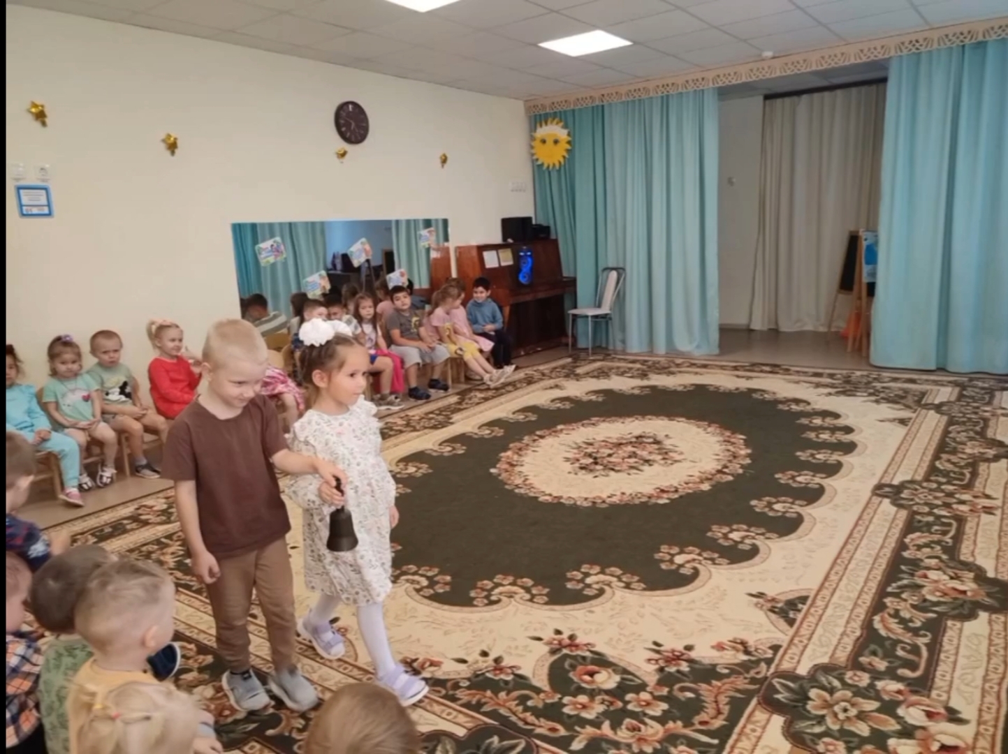 На утренниках дети пели песни, исполняли танцы, играли в веселые игры, рассказывали стихи. Кульминацией праздника стало угощение - вкусные, сочные наливные яблочки. Все присутствующие получили много позитивных эмоций!Балалар бакчасында бәйрәм - ул һәрвакыт гаҗәеп могҗизалар, тылсымлы буяулар, балаларның яңгыравыклы көлүләре, елмаюлар һәм күңел ачулар диңгезе. Көзнең моңсу вакыты дисәләр дә, балалар аяк астында коелган алтынсу яфраклар кыштырдавына, зонтик астында йөрергә, кызыклы булган яңгырга шатлана алалар. Менә ни өчен балалар бакчасында Көз бәйрәме безнең балаларның иң яраткан бәйрәмнәренең берсе булып тора. Тышта салкынча, ә безнең иртәләрдә җылы, ягымлы атмосфера хөкем сөрә иде. Балалар иртәнге бәйрәмнәрдә җырлар җырладылар, биюләр башкардылар, күңелле уеннар уйнадылар, шигырьләр сөйләделәр. Бәйрәмнең кульминациясе-тәмле сусыл алма. Катнашучыларның барысы да бик күп уңай хис-кичерешләр алды!
