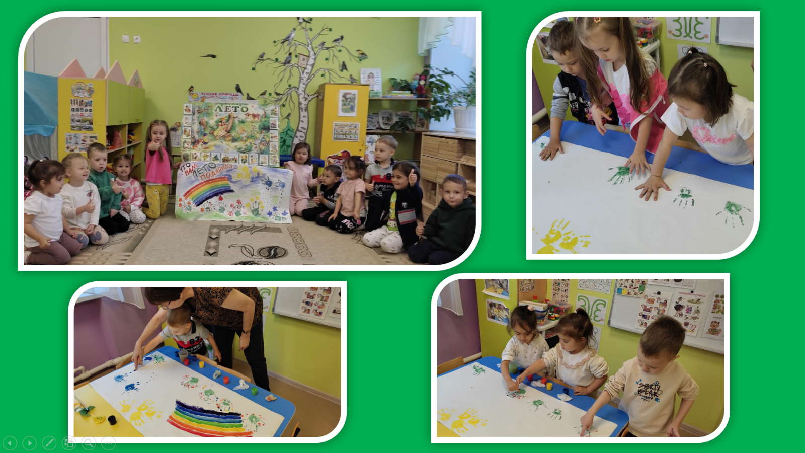 Прошла уже летняя беззаботная пора. О ней остались лишь воспоминания. Но воспоминания эти яркие, насыщенные, разноцветные - как радуга на небе! Дети средней группы №2 вместе с воспитателем Хуснутдиновой Лилией Наильевной в коллективной работе передали с помощью своих ладошек радость от прошедшего лета!