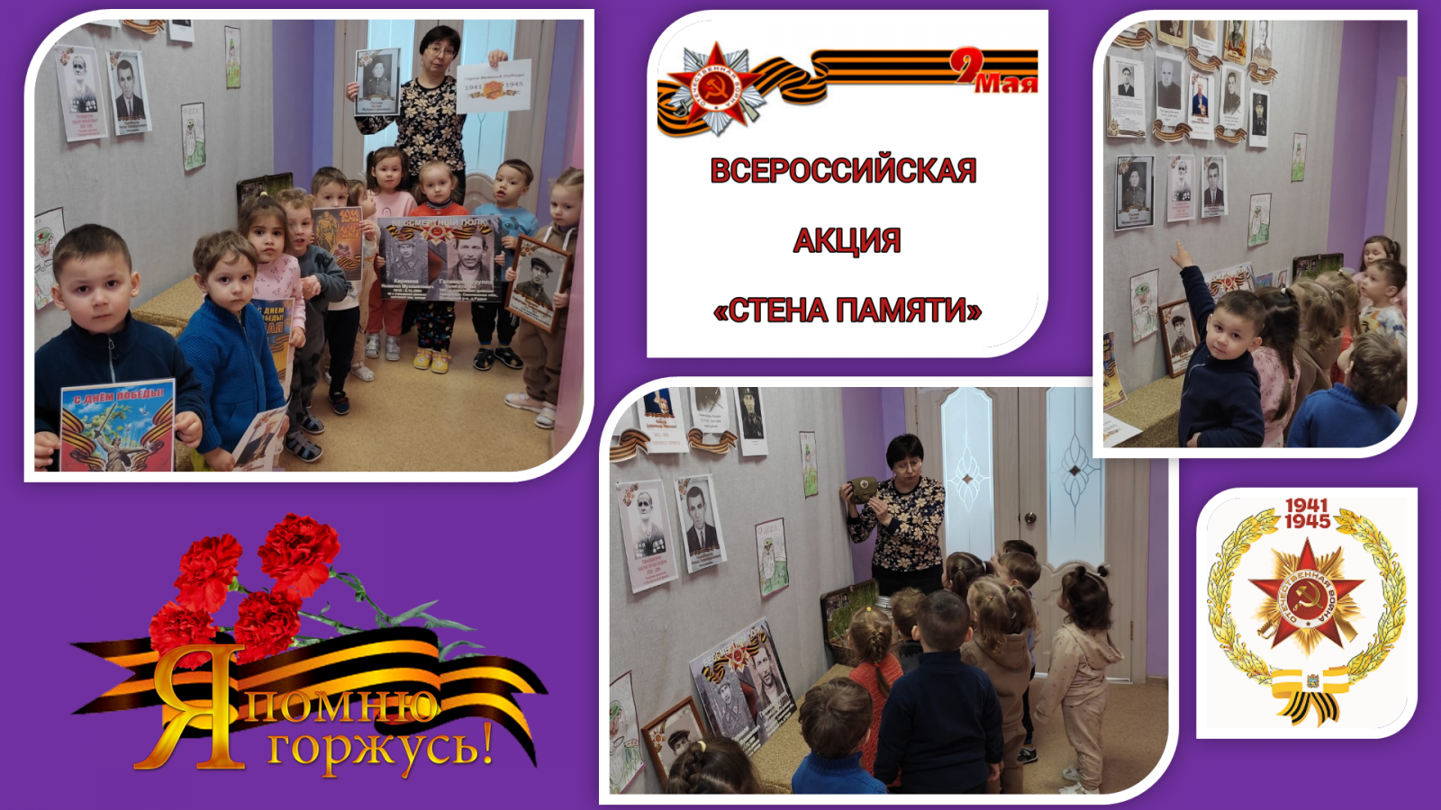 Народ жив, пока хранит память о тех, кто подарил ему жизнь! Всероссийская общественная акция «Стена Памяти» – это один из новых форматов Всероссийской акции «Бессмертный полк». Наша акция – это возможность собраться всей семьёй, с самыми близкими, достать старые фотографии и медали наших родных Героев, рассказать детям их историю Победы. И принести их портрет вместе с земляками, чтобы почтить память каждого. И как бы кто ни пытался, эта нить памяти никогда не прервётся. Потому что мы гордимся прошлым, гордимся нашими Героями и будем вечно помнить их подвиг! И в нашем детском саду организована «Стена Памяти» посвященная празднику День Победы! Ребята всех возрастных групп принесли портреты своих близких, которые были участниками Великой Отечественной Войны. Проходя мимо, говорили: «Это мой прадед, он воевал, и я им горжусь!»