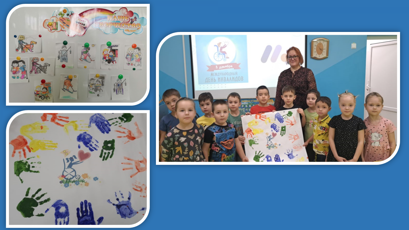 В рамках тематической недели «Протяни руку дружбы» посвящённому декаде инвалидов в группах старшего дошкольного возраста педагогом - психологом Шараповой А.М. была проведена акция «Такие ли мы разные». В ходе акции ребята узнали о том, что в мире есть люди с инвалидностью ограниченные физически, но они безграничны в своих способностях, талантах и стремлении к самовыражению. Благодаря огромной силе духа и воли, эти люди добиваются успехов в самых разнообразных сферах: наука, художественное творчество, искусство, спорт. Среди них много тех, чья жажда жизни, удивительное мужество и даже героизм просто поражают. Наши ребята также создали коллективную работу «Хоровод дружбы».Так поможем же этим людям осуществить их мечту! Не забывайте про тех, кто нас окружает, кто нуждается в нашем внимании и заботе.