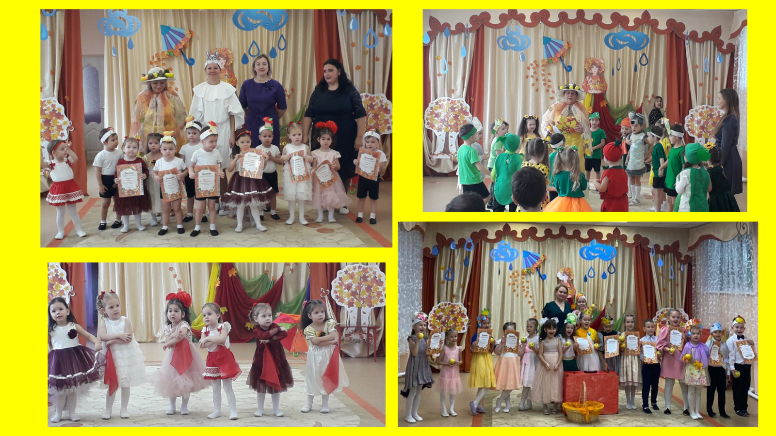 В нашем детском саду прошли осенние праздники для всех возрастных групп. Красавица Осень заглянула в каждую группу и к большим и к маленьким, никого не оставила без внимания, а дети встречали её как дорогую гостью - с песнями, танцами, сказками, играми, шутками да прибаутками! Праздник осени в детском саду является одним из любимейших мероприятий, ведь именно во время торжественных утренников ребятишки могут и повеселиться, и на других посмотреть, и себя показать. И, несмотря на то, что осень называют «унылой порой», тем не менее, кто как не дети больше всего радуются яркому украшению зала. Сюрпризы обеспечили всем многообразие ярких впечатлений на долгое время. Сказочные персонажи порадовали играми и веселыми шутками. Но и, конечно, какой праздник без угощения? Осень принесла детям всех возрастных групп вкусные яблоки. Праздник доставил радость и удовольствие как участникам, так и всем родителям, кто пришел посмотреть на выступление детей.