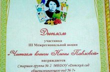 Стало доброй традицией посещение детской центральной библиотеки. Цель этих посещений приобщение дошкольников к миру книжной культуры, воспитание грамотного читателя. Старшая группа №2 вместе с воспитателем Галимовой Л.Р. приняли участие в мероприятии в рамках III Межрегиональной акции «Читаем книги Нины Павловой» – Громкое чтение с элементами театрализации «Мохнатые и пернатые герои Нины Павловой», организованной МБУ «Централизованная детская библиотечная система» муниципального образования «ЛМР» РТ Центральная детская библиотека им. Ю.Гагарина, за активное участие на мероприятии воспитанники были награждены дипломом.