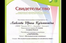 Поздравляем учителя английского языка Алексееву Ирину Кузьминичну, которая подготовила лауреата II степени Российского конкурса-олимпиады "Эврикум"