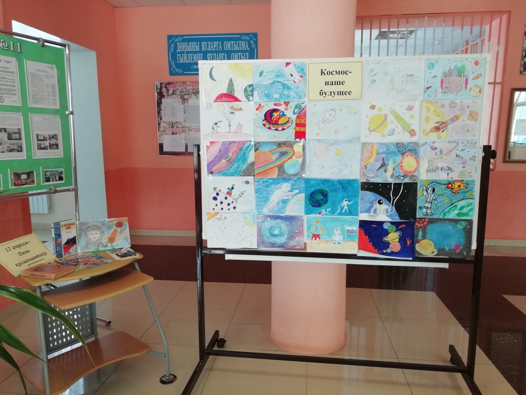 В связи с этой памятной датой 12 апреля 2021 года в МБОУ «Гимназия № 11» организована книжная выставка, оформлен стенд с рисунками учащихся «Космос – наше будущее».