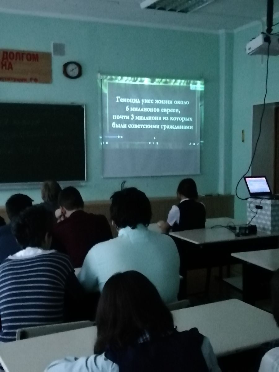 27 января ежегодно во всем мире чтят память погибших евреев во время Второй мировой войны. Холокост — одна из самых печальных страниц истории. На классном часу учащиеся 8б класса посмотрели обсуждали документальный фильм «Помнить, чтобы жить!». Холокост, это трагедия, которую учащиеся должны осознать. Ребята минутой молчания почтили память всех жертв самой страшной и жестокой войны.
