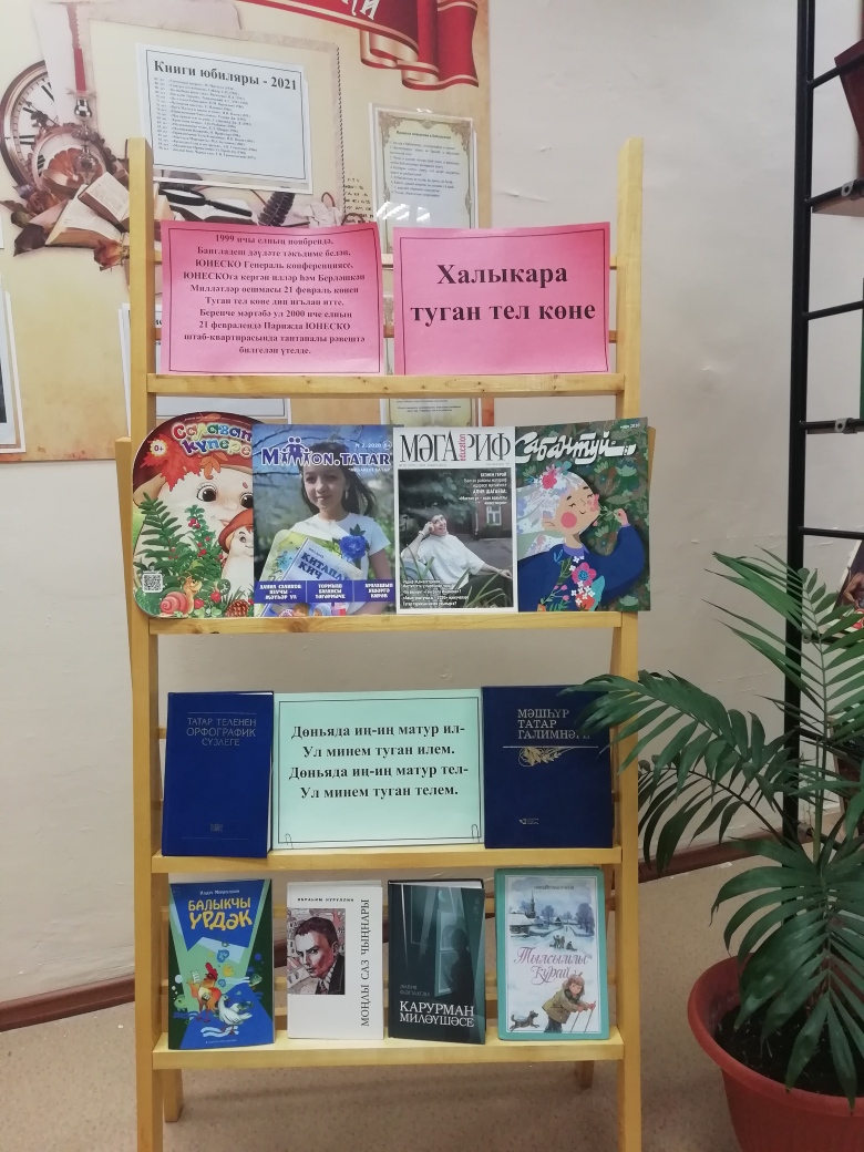 Шул уңайдан Халыкара туган тел көне кысасында 29 нчы гыйнвар көнне Гимназиядә туган тел көненә багышланган “Дөньяда иң-иң матур ил- Ул минем туган илем. Дөньяда иң-иң матур тел- Ул минем туган телем” дип исемләнгән китаплар күргәзмәсе оештырылды.