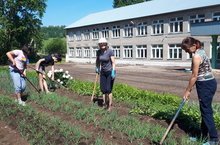 Идёт работа на пришкольном участке.