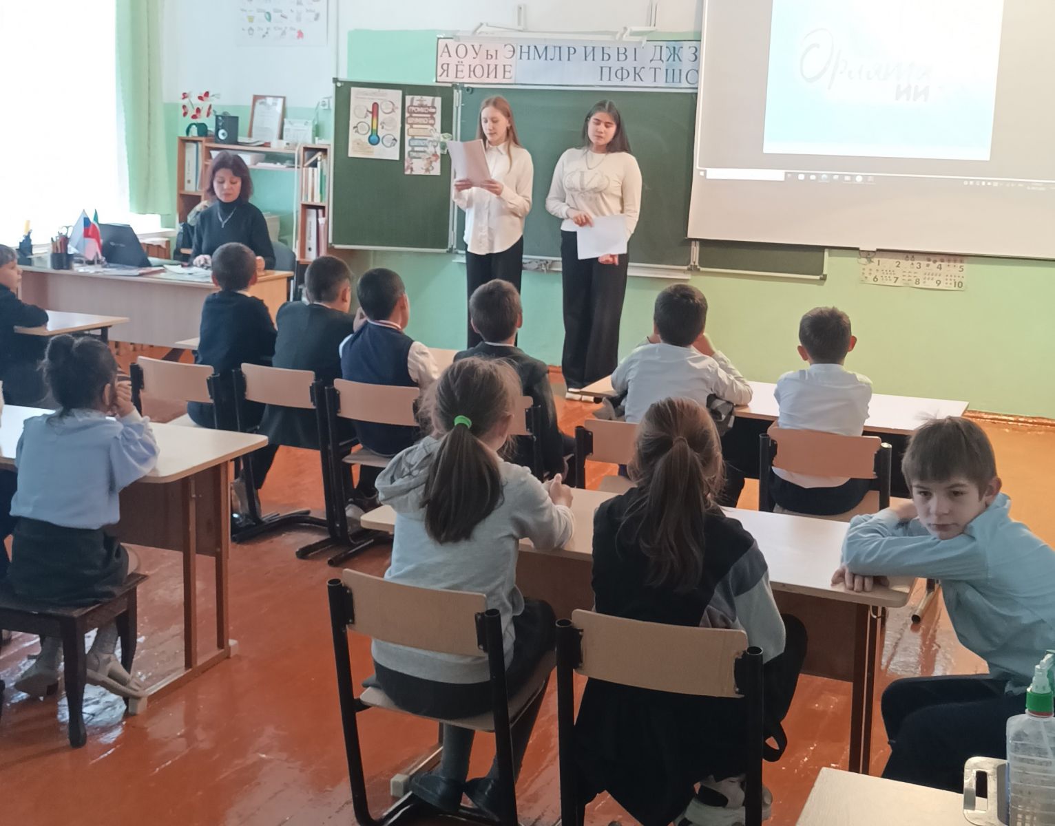 Лидеры Движения Первых Трофимова Валерия и Сайрахмонова Сарвиноз провели мероприятие среди учащихся начальных классов, посвящение первоклассников в Орлята России