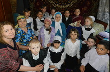 2-3 нче сыйныф укучылары , класс җитәкчесе Хәйретдинова Рамилә һәм ветераннар советы рәисе Рәзинә апалары белән ,Керкәле авылында иң өлкән кеше - 97 яшлек Хәмидә әбидә кунакта булдылар.