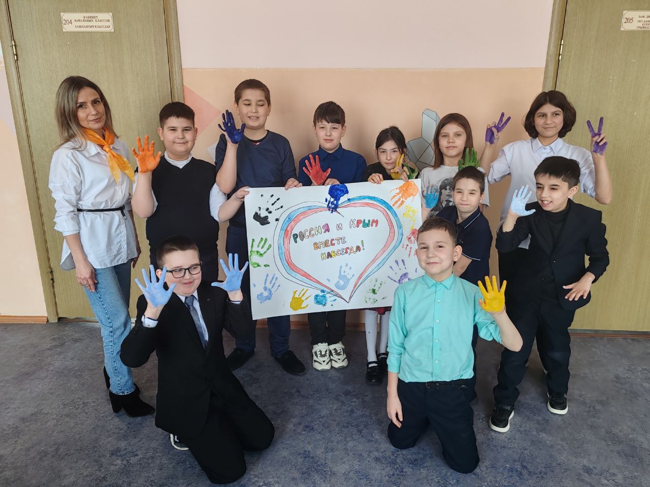 В этот день в нашей школе советником директора по воспитанию Зубок Э.Ф. совместно с учителями начальных классов и активом школы было организовано и проведено коллективно-творческое мероприятие «Россия и Крым вместе навсегда!» .