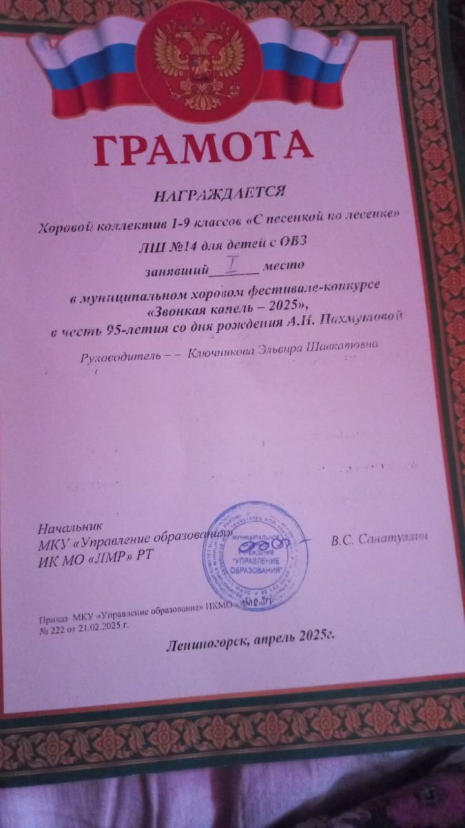 Школьный вокальный ансамбль "С песенкой по лесенке", руководитель Ключникова Э. Ш., выступили с песней "Бессмертный полк" на муниципальном хоровом фестивале-конкурсе "Звонкая капель - 2025", посвященному юбилею известного композитора-песенника А. Пахмутовой и заняли 1 место. Поздравляем! Желаем дальнейших творческих успехов!