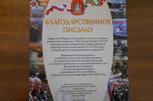 Учитель истории Марисова М.С. приняла активное участие в республиканском конкурсе "Растим патриотов России", посвященного 70-летию Победы в Великой Отечественной войне 1941-1945 годов. Поздравляем!!!