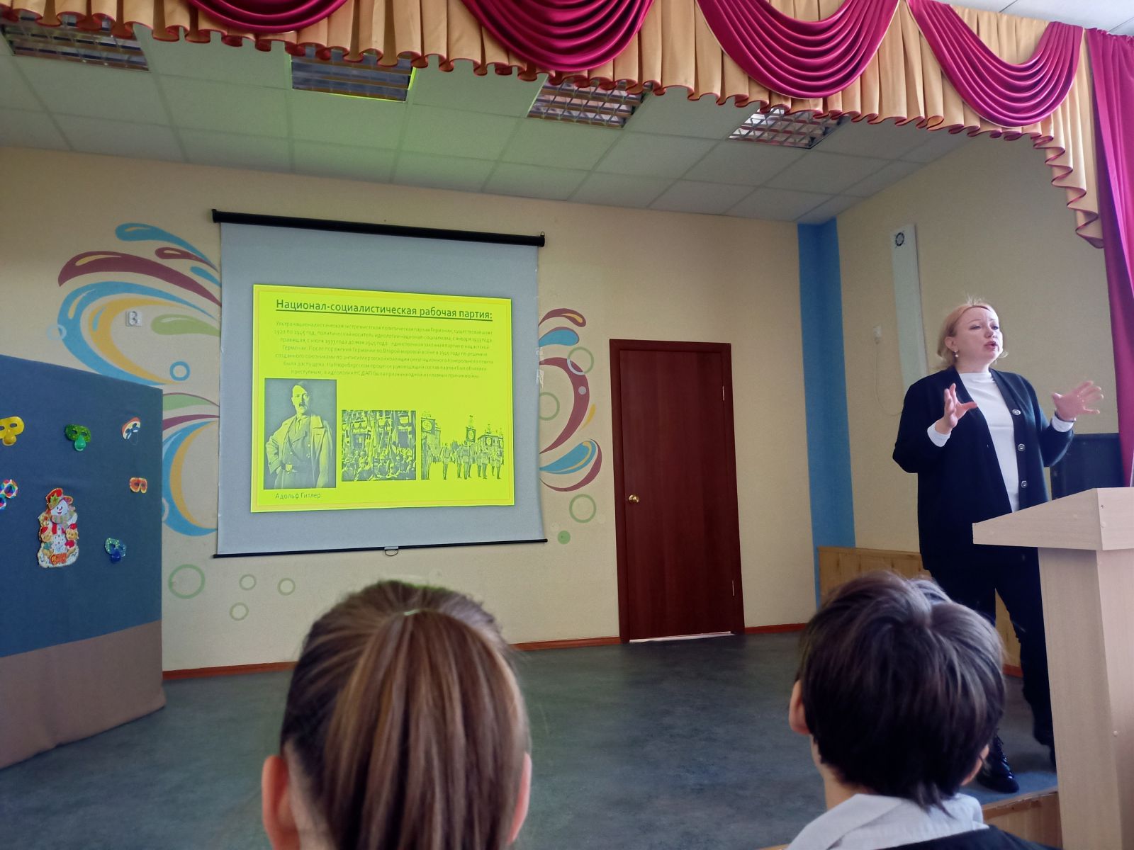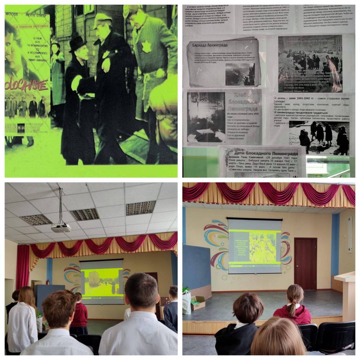 Для учащихся 9 класса был устроин просмотр фильмов с обсуждением учителем истори Марисовой М.С. по теме «Холокост» и «Снятие блокады Ленинграда».