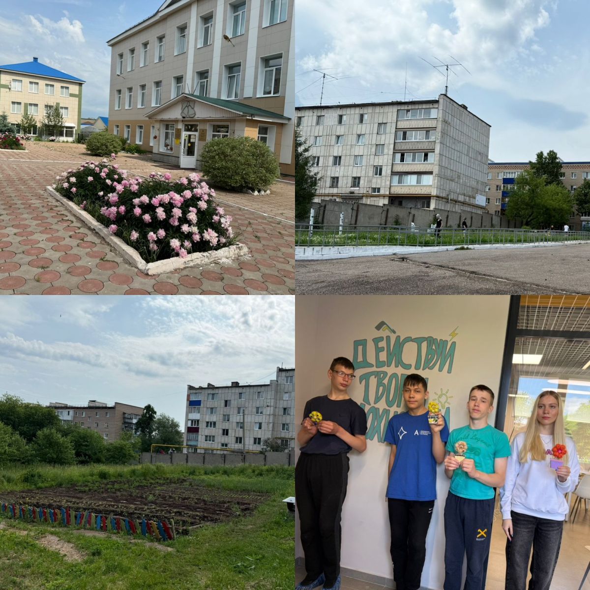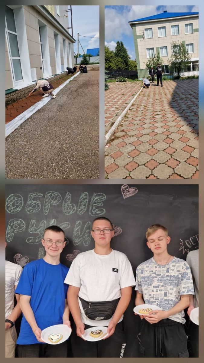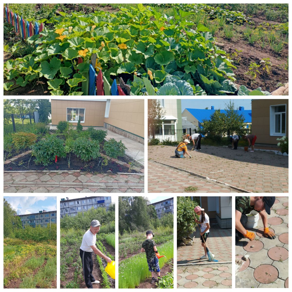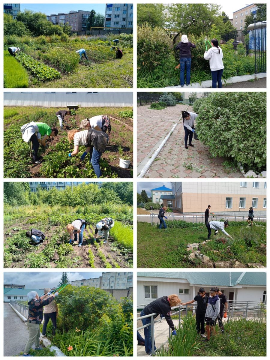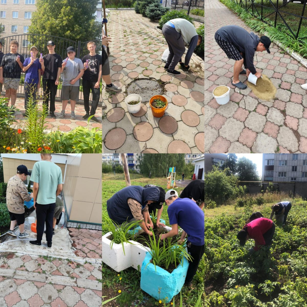 Дружная команда учителей в составе Борисовой Н. Ю., Панковой И.И., Перовской К. Р. и Сафина Д. Г., и учащихся 7 класса выполнила большой объем работы: выполнена вырубка борщевика и сорняков около смородины; облагорожена альпийская горка, цветники около дороги; прополоты клумбы около школы; собраны лук чеснок и посажены на это место укроп и петрушка; собраны личинки жуков на картошке; почищена плитка от травы вокруг школы, тротуар перед школой.