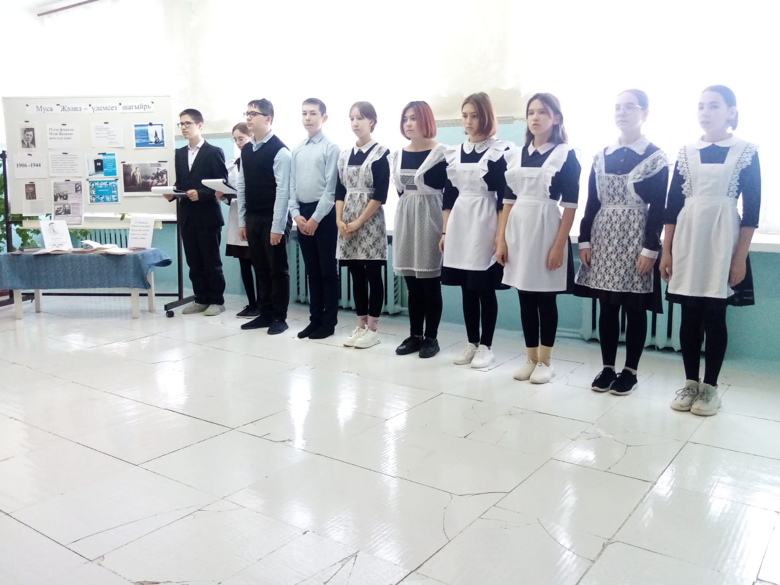 15 февраль - татар халкының батыр улы М.Җәлилнең туган көне. Шул уңайдан мәктәбебездә “М.Җәлил – үлемсез шагыйрь” дигән исем астында аны искә алу чарасы узды. Укучылар шагыйрьне батырлыкка илткән юл белән таныштылар, аның үлемсез шигырьләрен сөйләделәр. Укучылар М.Җәлилнең безнең өчен батырлык үрнәге булып торуына тагын бер кат инандылар.