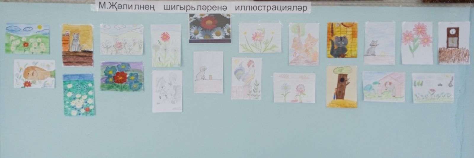 Атналык кысаларында 14 февраль көнне 1-9 класс укучыларының М.Җәлил әсәрләренә ясалган рәсемнәреннән күргәзмә оештырылды. Укучылар күбрәк “Кызыл ромашка”, “Әтәч”, “Карак песи”, “Маэмай” шигырьләренә тукталганнар. Чараның максаты – М.Җәлилнең әдәби мирасы белән кызыксыну формалаштыру.