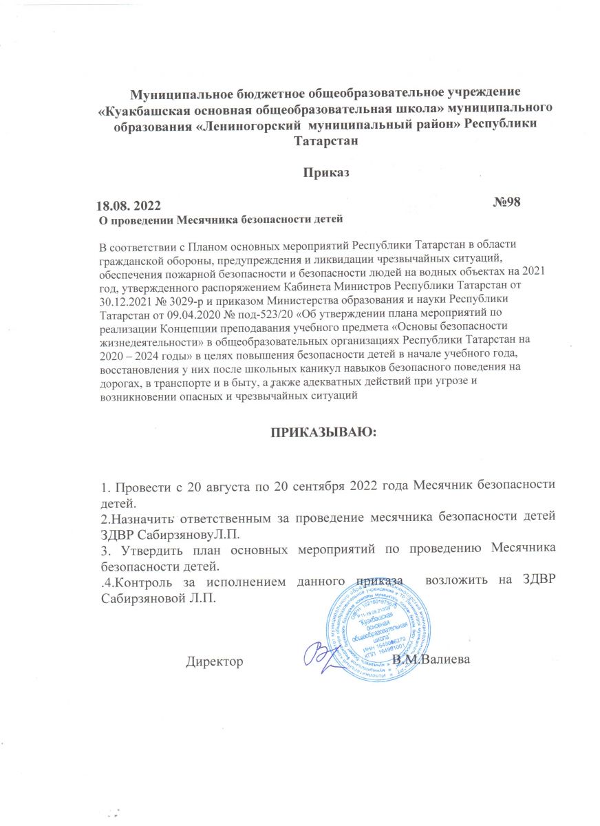 В целях повышения безопасности детей в начале учебного года, восстановления у них после каникул навыков безопасного поведения на дорогах, в транспорте и в быту, а также адекватных действий при угрозе и возникновении опасных и чрезвычайных ситуаций с 20 августа по 20 сентября в школе проходит Месячник безопасности детей. В рамках Месячника безопасности детей 5 сентября классные руководители провели Всероссийский урок по основам безопасности жизнедеятельности с отработкой вопросов срочной эвакуации из здания школы.