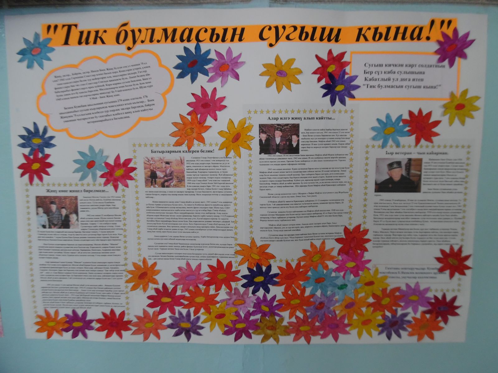 Бөек Җиңүнең 75 еллыгына илебездә зур әзерлек эшләре барганда, Ватанны саклаучылар көне уңаеннан чыгарылган бу газеталарыбыз илебезгә җиңү алып кайтучы ветераннарыбызга, герой якташларыбызга, сугыш елларының каһарман балаларына багышлана.