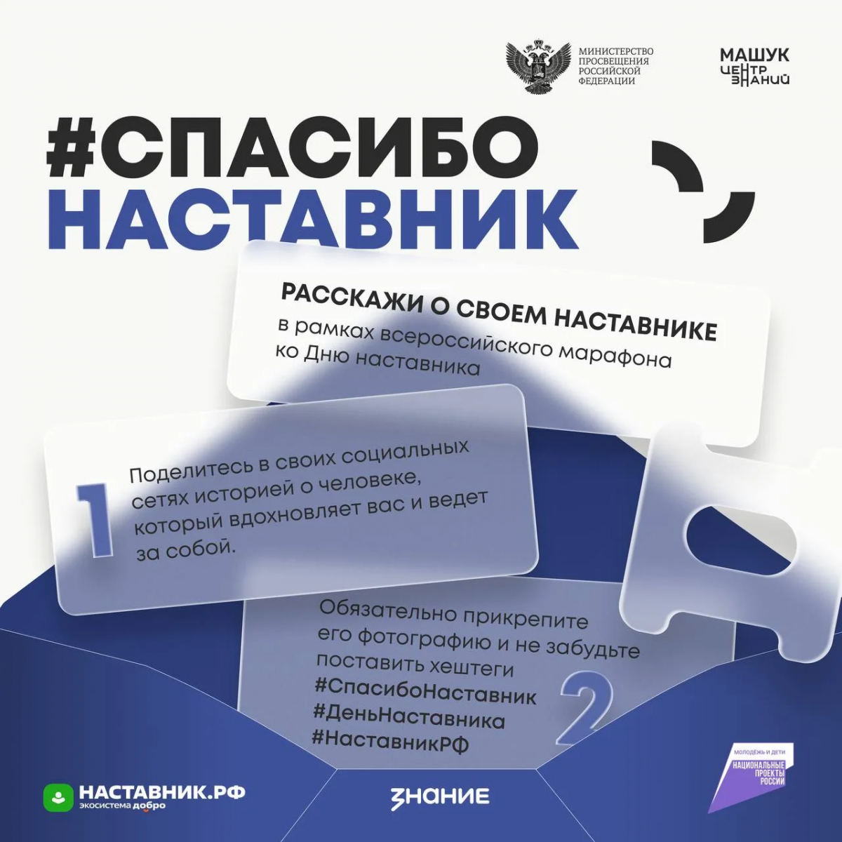 У каждого из нас есть человек, который однажды сказал нужные слова, поддержал или помог поверить в себя. Именно с таких людей начинается путь вперёд. Ко Дню наставника Центр знаний «Машук» совместно с Минпросвещения России при поддержке Российского общества «Знание», платформы Наставник.РФ и нацпроекта «Молодёжь и дети» запускает марафон благодарности #СпасибоНаставник. Это возможность сказать «спасибо» тем, кто был рядом, делился опытом, направлял и помогал становиться сильнее.