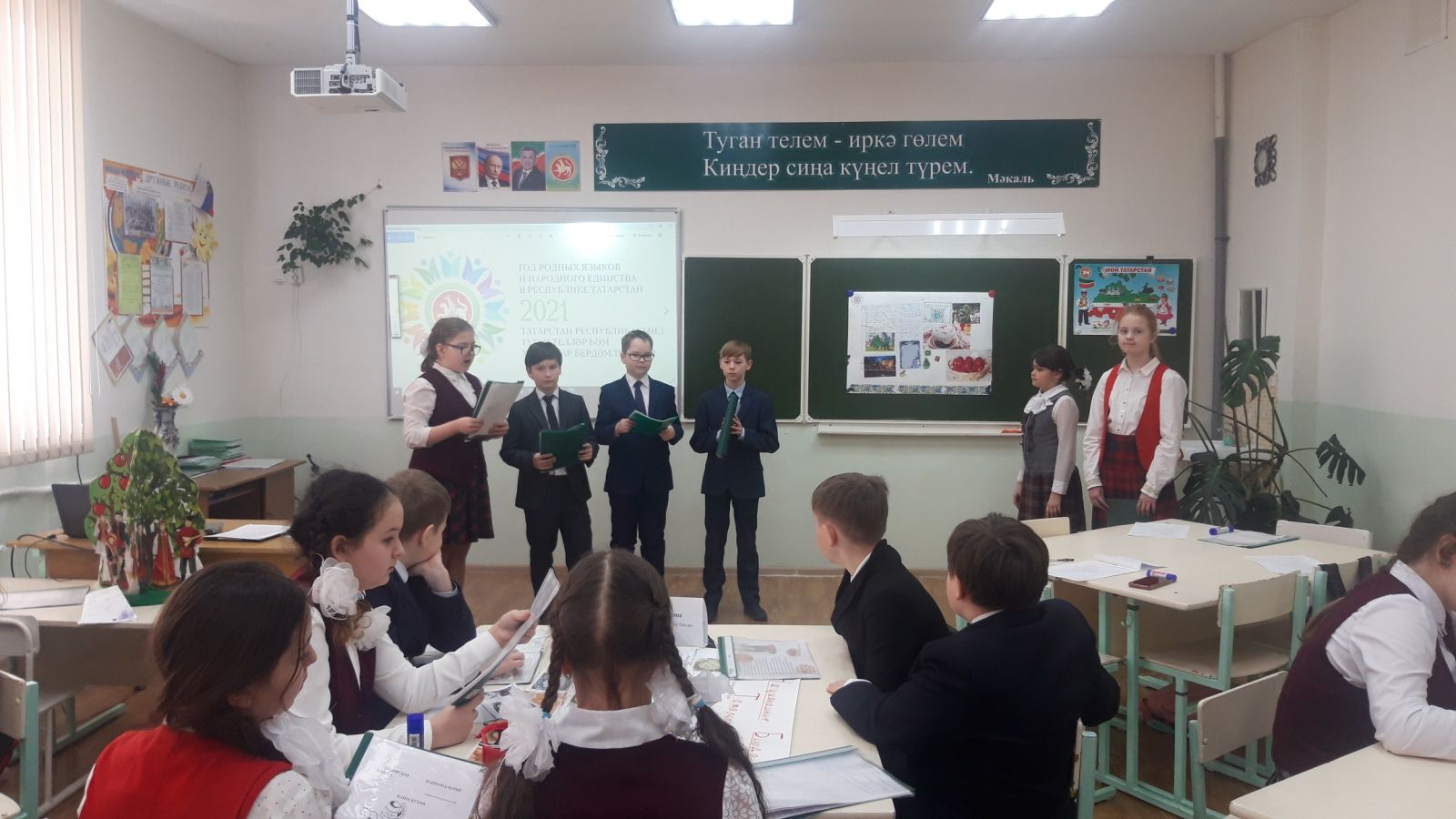 Туган телләр һәм халыклар бердәмлеге елы кысаларында, 7 нче сыйныфта (сыйныф җитәкчесе – Родионова Е.В.) «Күпмилләтле Татарстан» темасы буенча төркем проектларын яклау үтте. Әлеге чараның максаты - Татарстан Республикасы халыкларының тарихи һәм рухи традицияләрен, мәдәниятләрен һәм телләрен өйрәнү процессында укучыларны мәдәни яктан үстерү. Төркемнәрдә укучылар безнең республика халыклары турында проектлар әзерләделәр, әлеге проектларда татар, чуваш һәм мордваларның милли костюмнары, милли ашамлыклары, мәдәнияты, гореф-гадәтләре чагылыш тапты.