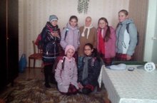 На фото группа учащихся 9 Б класса дома с Лапицкой С.И. и ее зятем, в чьей семье проживает Софья Ивановна.