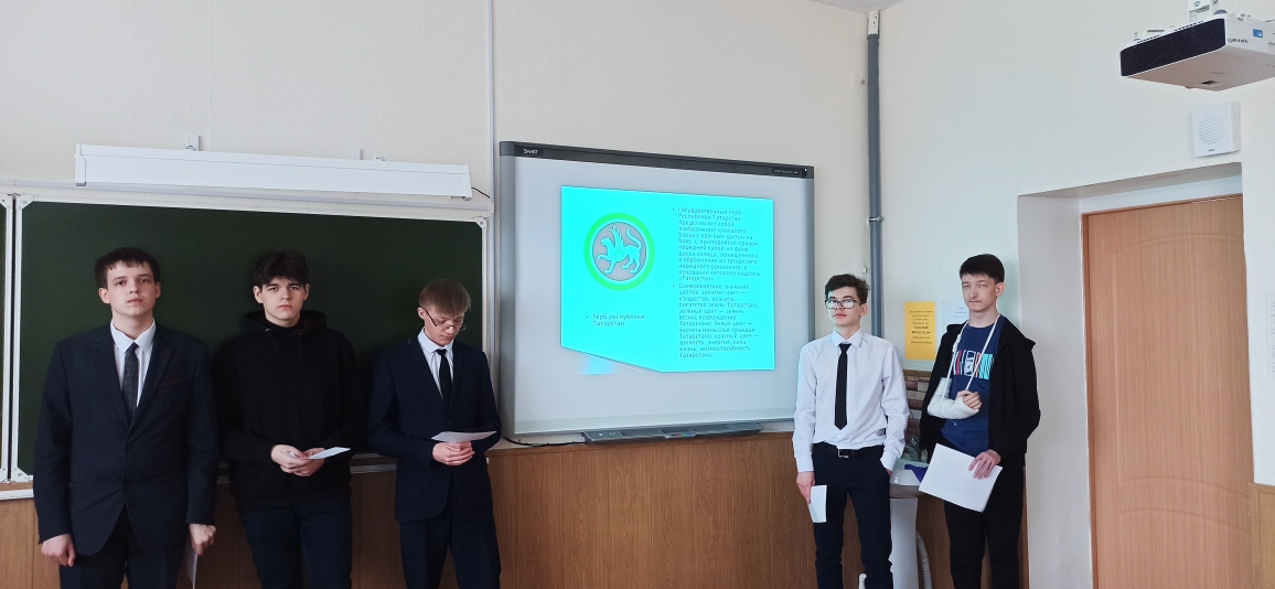 В 10 Б классе прошёл классный час, посвящённый символам РФ и РТ. По окончании классного часа учащимися был исполнен гимн РФ.