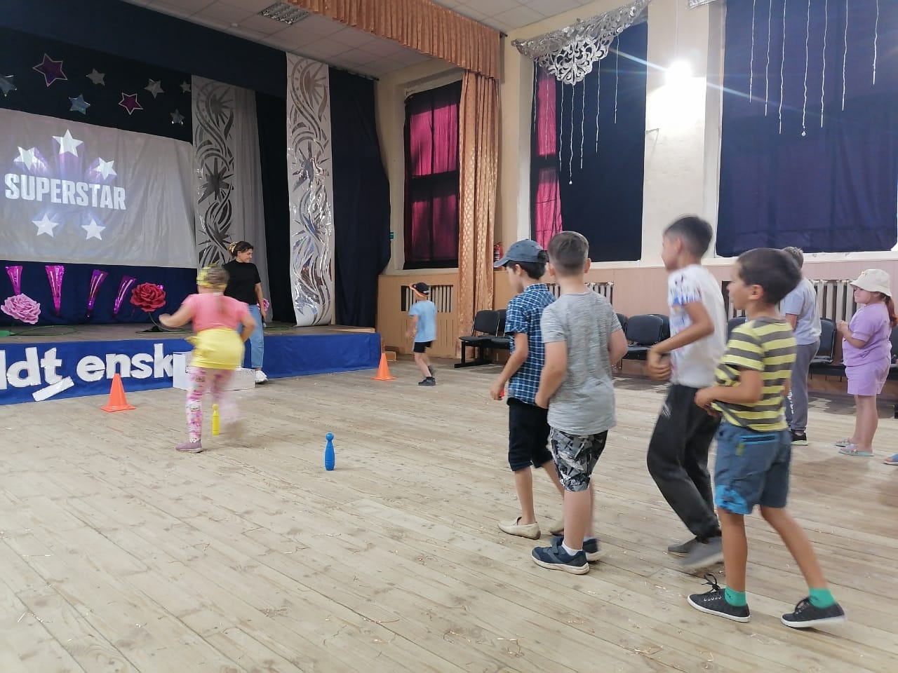 Дети пришкольного лагеря «Солнышко» приняли участие в развлекательном мероприятии «Суперстар». Ребята активно участвовали в командных конкурсах, танцевали, рисовали, отгадывали загадки. В конце мероприятия для ребят была организована дискотека.