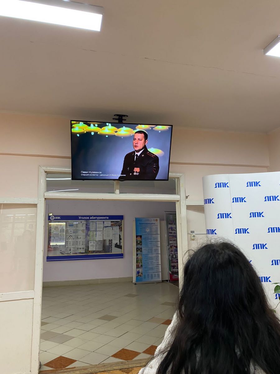 В фойе колледжа транслировались социальные ролики на тему: «Безопасность дорожного движения», «Безопасность пешеходов — нерегулируемые пешеходные переходы», «Правила безопасности на скутерах и мопедах», «Остановись! Безопасный велосипед» и др.