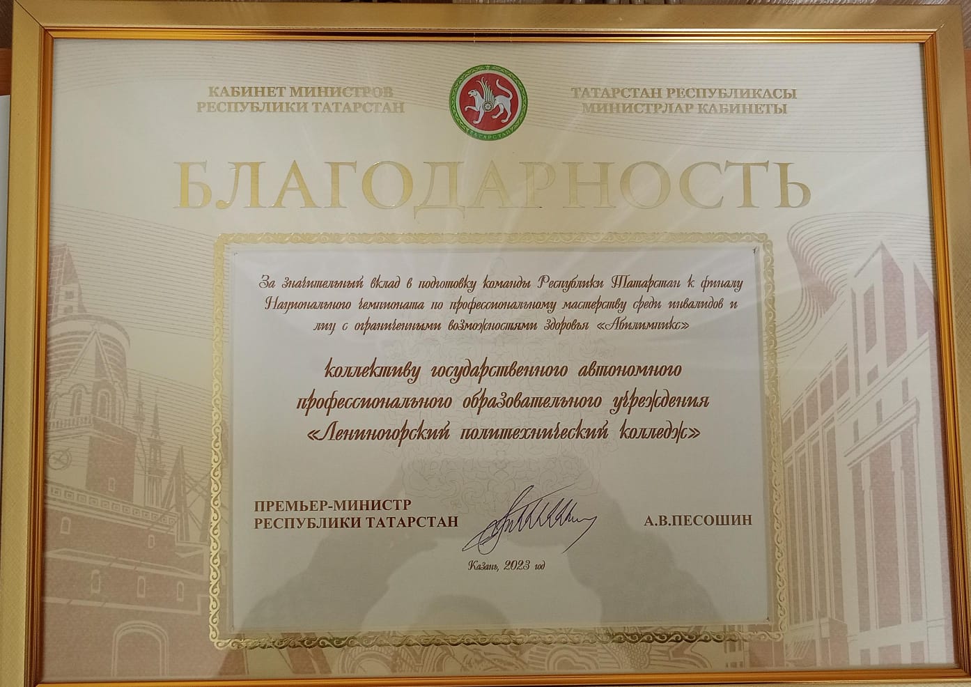 11 декабря 2023 года состоялась торжественная встреча Раиса Республики Татарстан Р.Н.Минниханова с победителями и призерами Всероссийского чемпионатного движения по профессиональному мастерству «Профессионалы» и Национального чемпионата по профессиональному мастерству среди инвалидов и лиц с ограниченными возможностями здоровья «Абилимпикс» 2023 года.