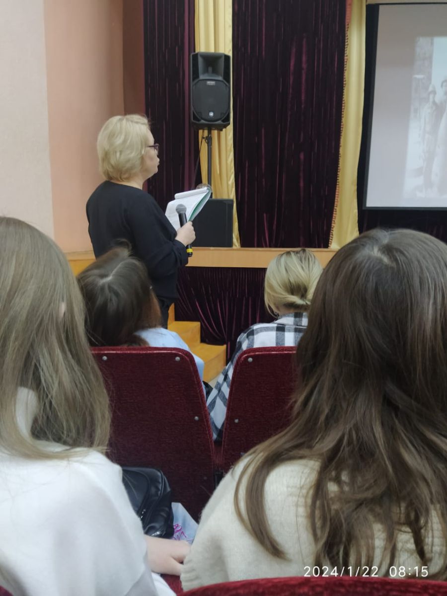 Преподаватель Осипова А.Н. провела классный час в актовом зале для обучающихся по теме "Непокорённые. 80 лет со дня полного освобождения Ленинграда от фашистской блокады."