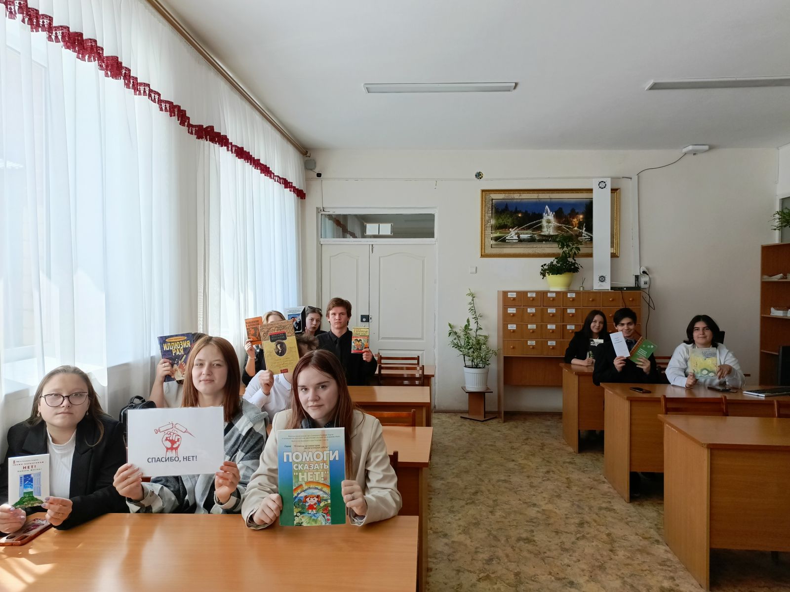 Ребята активно включились в диалог, обсуждая мифы и реалии употребления наркотиков, узнали об ответственности за употребление, хранение и сбыт наркотических средств. В читальном зале оформлена книжная выставка «Спасибо, нет!» Волонтеры раздали студентам информационные буклеты «Жизнь прекрасна – не трать ее напрасно!»