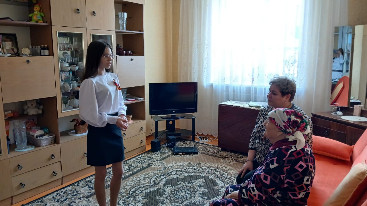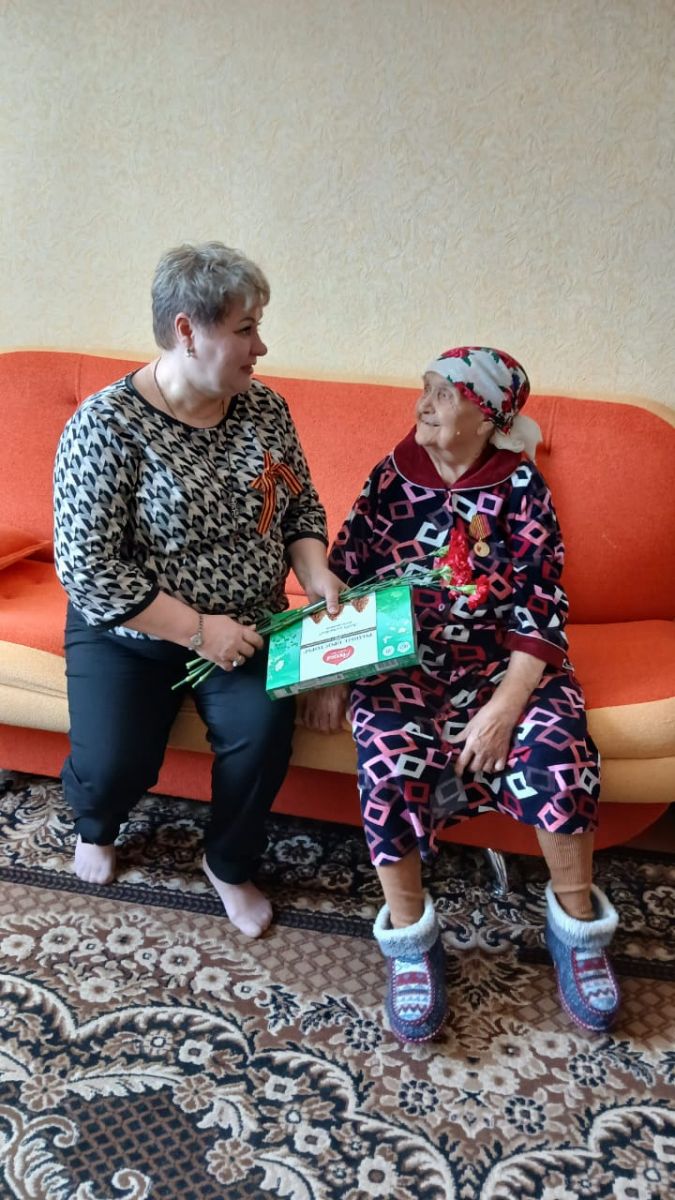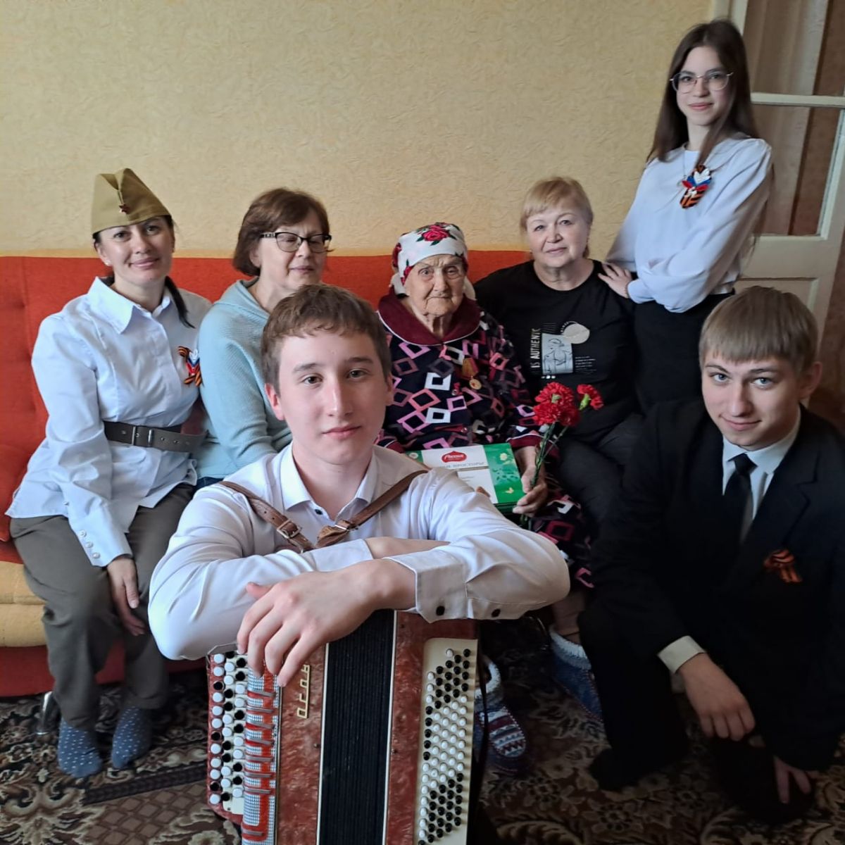 Сегодня в преддверии Дня Победы советник директора по воспитанию и взаимодействию с детскими общественными объединениями Зиля Мударисова и председатель профсоюзной организации Наталья Газиева вместе с активом студенческого совета посетили 98-летнюю труженицу тыла, ветерана труда Домну Ивановну Тимошкину.