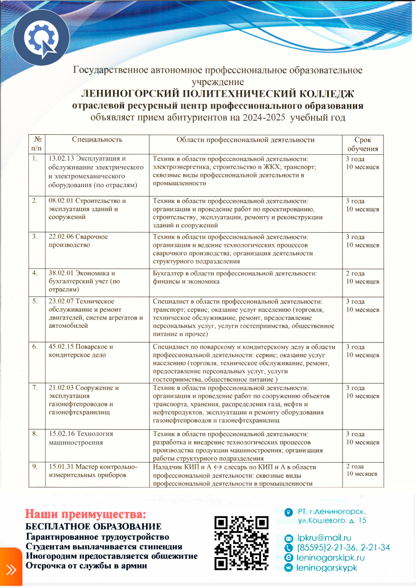 В Лениногорском политехническом колледже продолжается набор студентов на 2025–2026 учебный год. Абитуриентам предлагается обучение по актуальным и востребованным специальностям.
