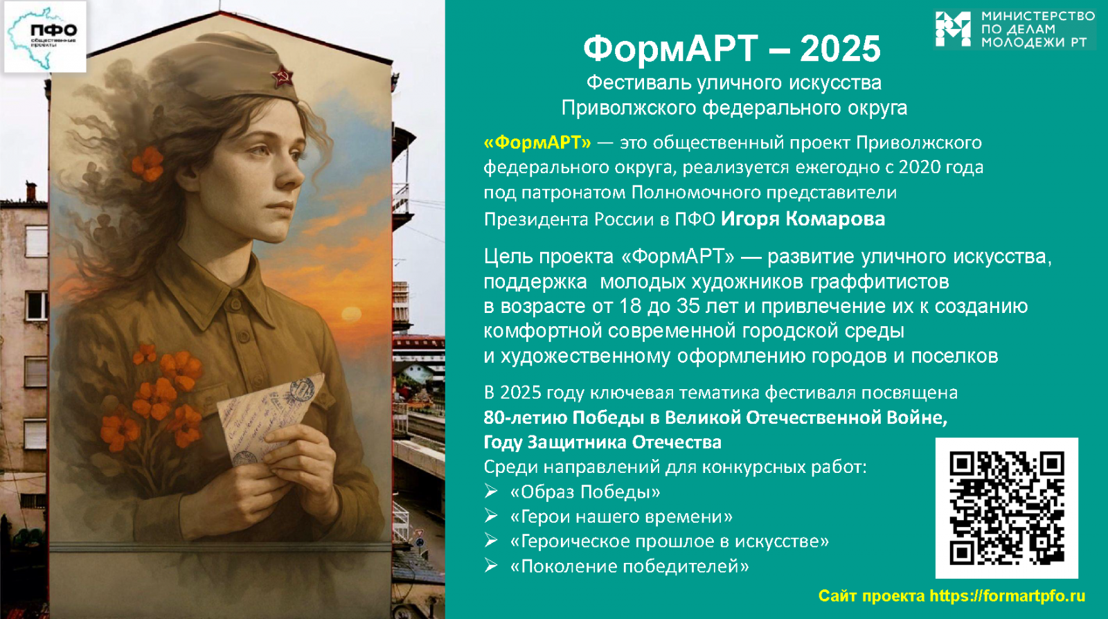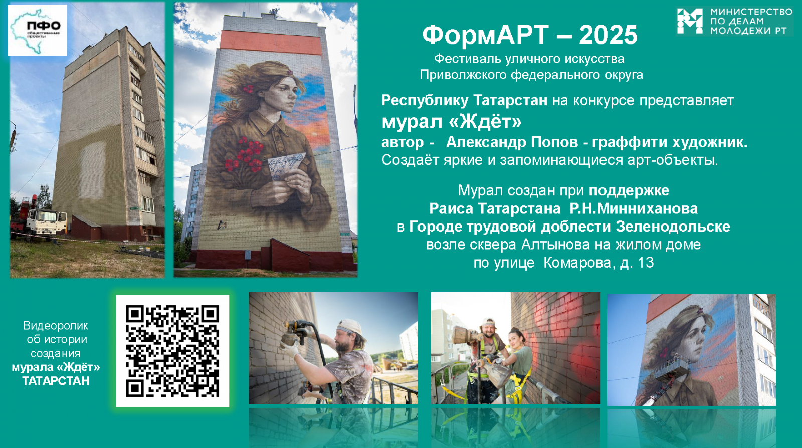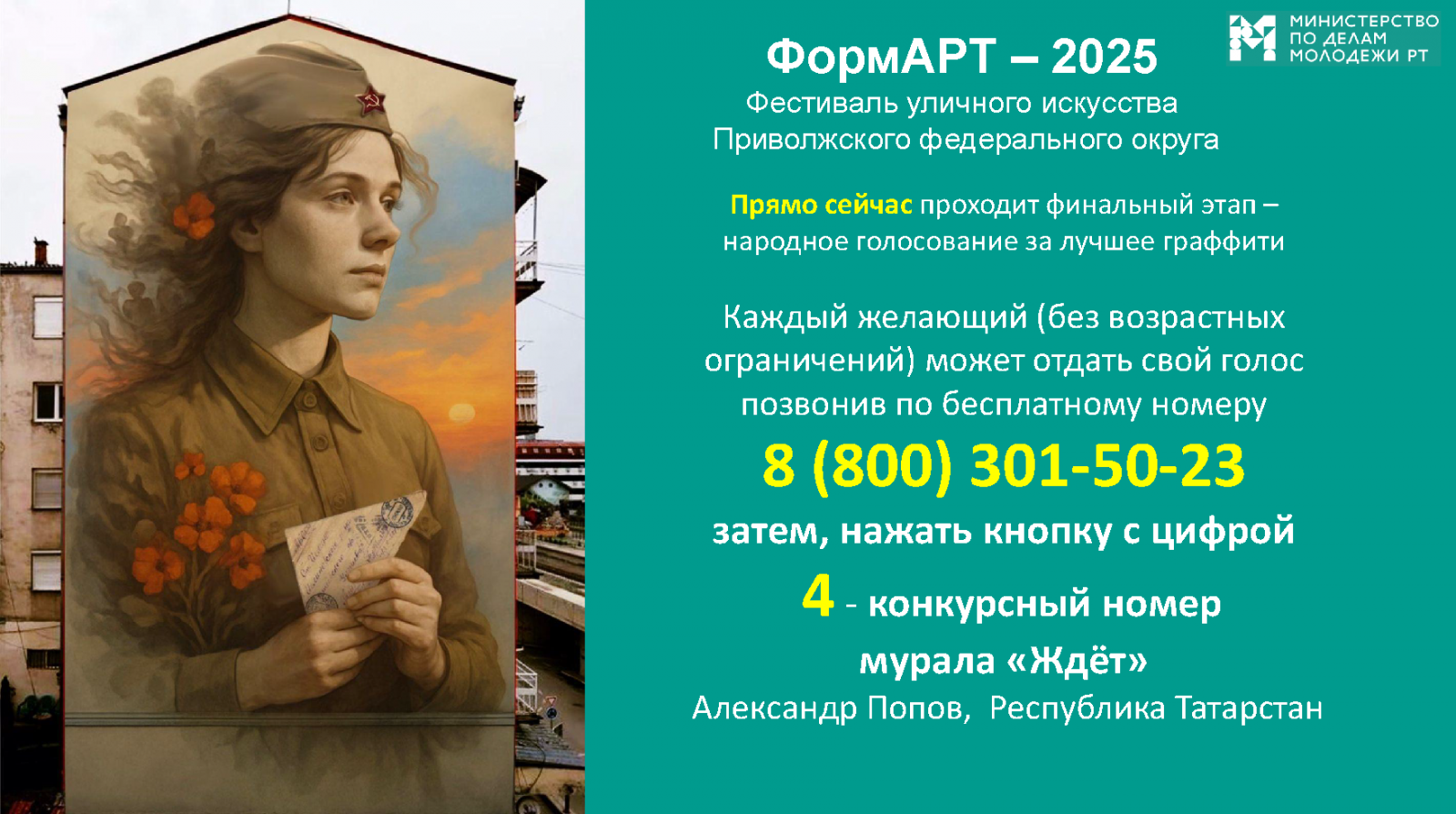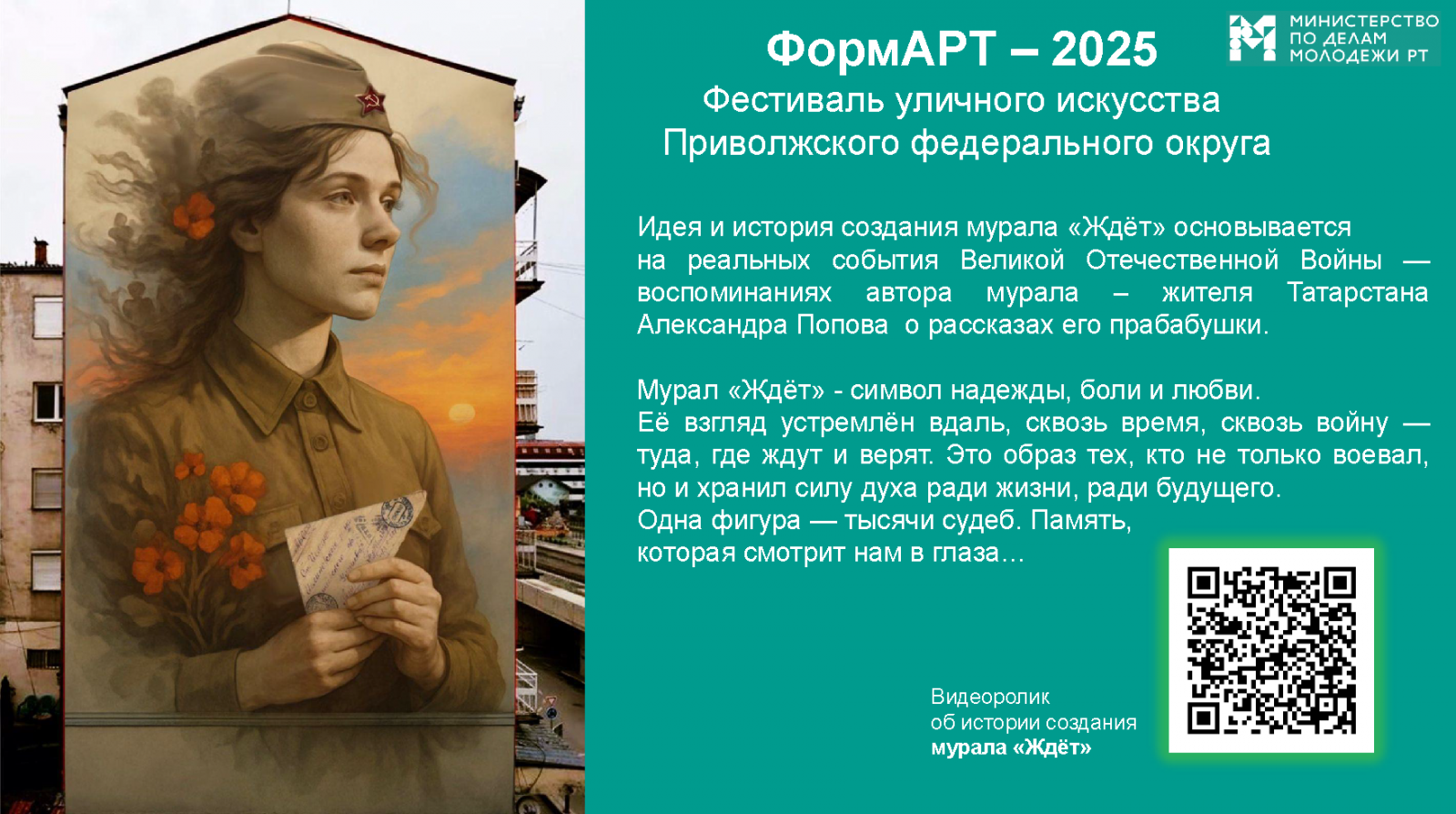 В конкурсе участвуют 14 авторов в возрасте от 18 до 35 лет. Ключевая тематика фестиваля связана с Годом 80-летия Победы в Великой Отечественной войне и Годом Защитника Отечества – «Образ Победы», «Герои нашего времени», «Героическое прошлое в искусстве», «Поколение победителей». Среди финалистов художник-граффитист Александр Попов из Татарстана. В Зеленодольске появился мурал «Ждёт». «Мурал посвящен победе в Великой Отечественной войне. Прообразом стала бабушка художника Александра Попова. На мурале – девушка в военной форме с треугольным фронтовым письмом. В её взгляде — боль разлуки и вера в будущее, любовь, которая сильнее войны. Это образ тысяч матерей, жён, сестёр, которые ждали и хранили силу духа ради жизни.