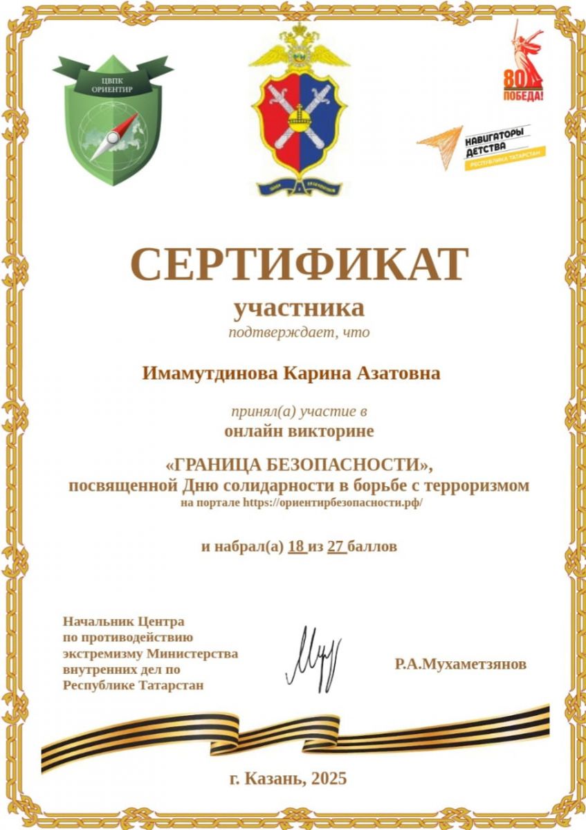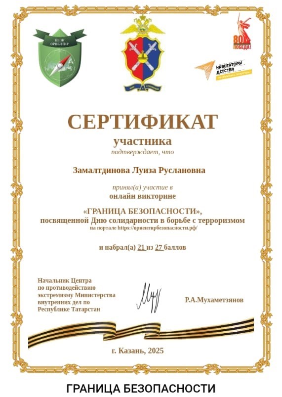 Советник директора по воспитанию Мударисова Зиля совместно с преподавателем ОБЖ провели онлайн-викторину «ГРАНИЦА БЕЗОПАСНОСТИ» для группы СЗ.25, посвященную Дню солидарности в борьбе с терроризмом. Викторина была разработана Центром по противодействию экстремизму МВД по РТ и АНО ДПО «ЦВПК «Ориентир» при поддержке регионального ресурсного центра Всероссийского проекта «Навигаторы детства» в Республике Татарстан.