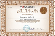 C 9 по 22 декабря 2013 года 5 учеников школы приняли участие в международном проекте videouroki.net, выполнив дистанционную олимпиадную работу по математике. Поздравляем всех участников: Самарина Максима - 10 класс, Исаева Анатолия - 10 класс, Михайлова Сергея - 9 класс, Саушкину Анастасию - 8 класс, получивших сертификаты участников проекта и Ванюкова Андрея - 9 класс, обладателя диплома 3 степени.