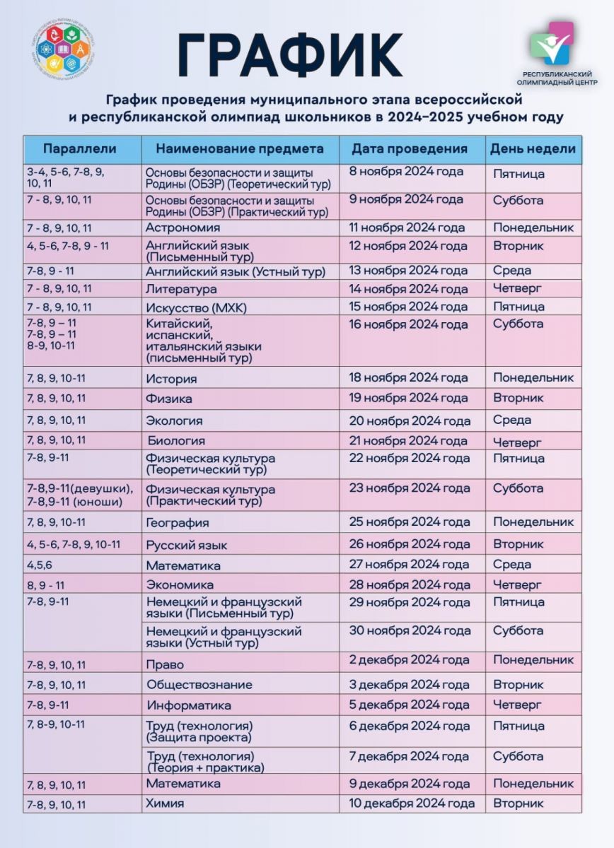 График проведения муниципального этапа всероссийской и республиканской олимпиад школьников в 2024-2025 учебном году.