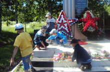 Бүген лагерьга йөрүче укучылар шефлык эшен һәйкәлләр барлаудан башладылар. Авыл уртасында яңа Җиңү аллеясы торгызылган иде. Аллея тирәсенә чәчкәләр утыртылган. Һәркөнне укучылар яшь үсентеләргә су сибәләр. Көчле җилдән соң һәйкәл тирәсен тәртипкә китерделәр.