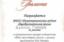Ученица 6 класса Вафина Гульнара, принявшая участие в муниципальном конкурсе видеороликов «Той, что подарила жизнь», была награждена дипломом участника и денежным сертификатом.