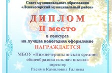 От имени администрации Лениногорского Муниципального района и города Лениногорска Нижнечершилинская СОШ награждена дипломом II степени в конкурсе на лучшее новогоднее оформление в номинации "Самое благоустроенное и художественно оформленное здание среди образовательных учреждений". Подписано Главой муниципального образования "Лениногорский муниципальный район", мэром города Лениногорска Р.Г.Хусаиновым.